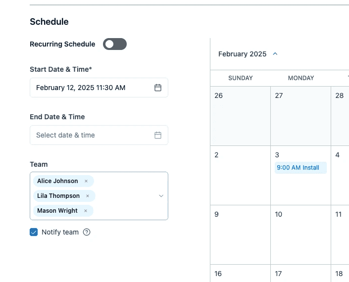 Assigning a team. I designed the assignment interaction to scale from one person to a crew without increasing cognitive load — each selection visible, removable, and immediately readable. On save, Loop Through List runs once per person. Each technician gets their own notification.